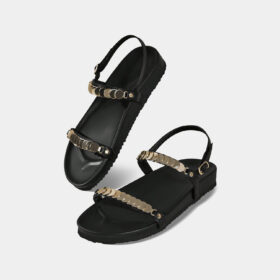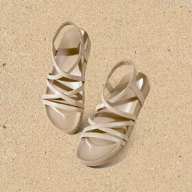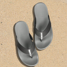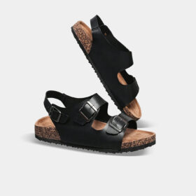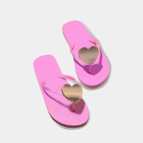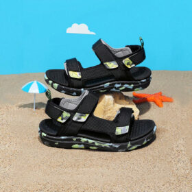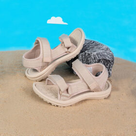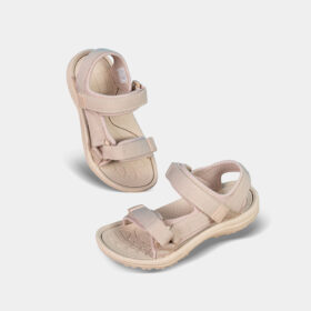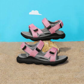A sporty open-toe sandal with pink adjustable straps, a gray cushioned mesh footbed, and a sturdy black rubber sole — blending comfort, durability, and playful style.